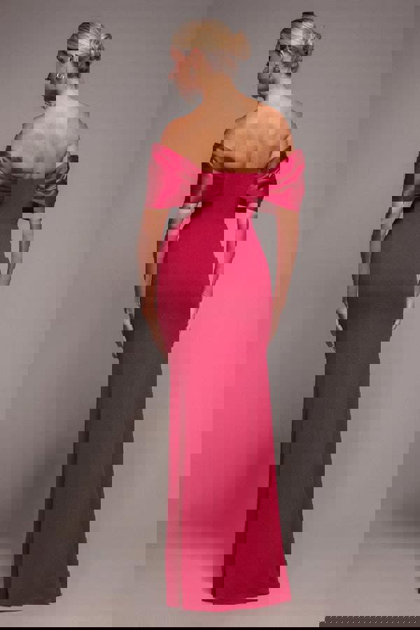 Bold, feminine, and effortlessly glamorous, the magenta Twist Knot Satin & Scuba Bardot Maxi Dress is the ultimate choice for any special occasion.