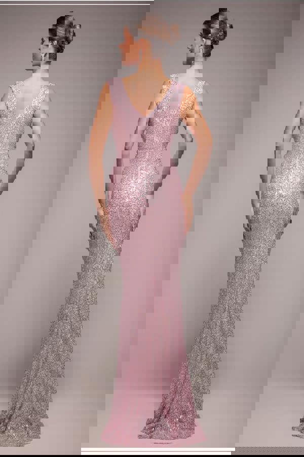 In its romantic blush colour, this long sequin gown will have you stealing the show at every event.