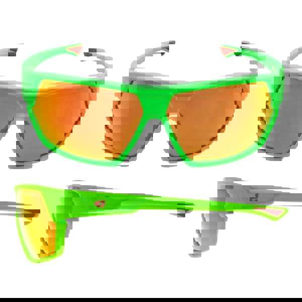 Polarised lenses with a mirror coating help reduce glare from reflective surfaces such as water, snow and roads. A UV400 filter blocks light rays up to 400 nanometres and provides protection against UVA, UVB and UVC exposure. Choose from Matt Neon Green/Red or Matt Neon Orange/Green for a high-impact look.