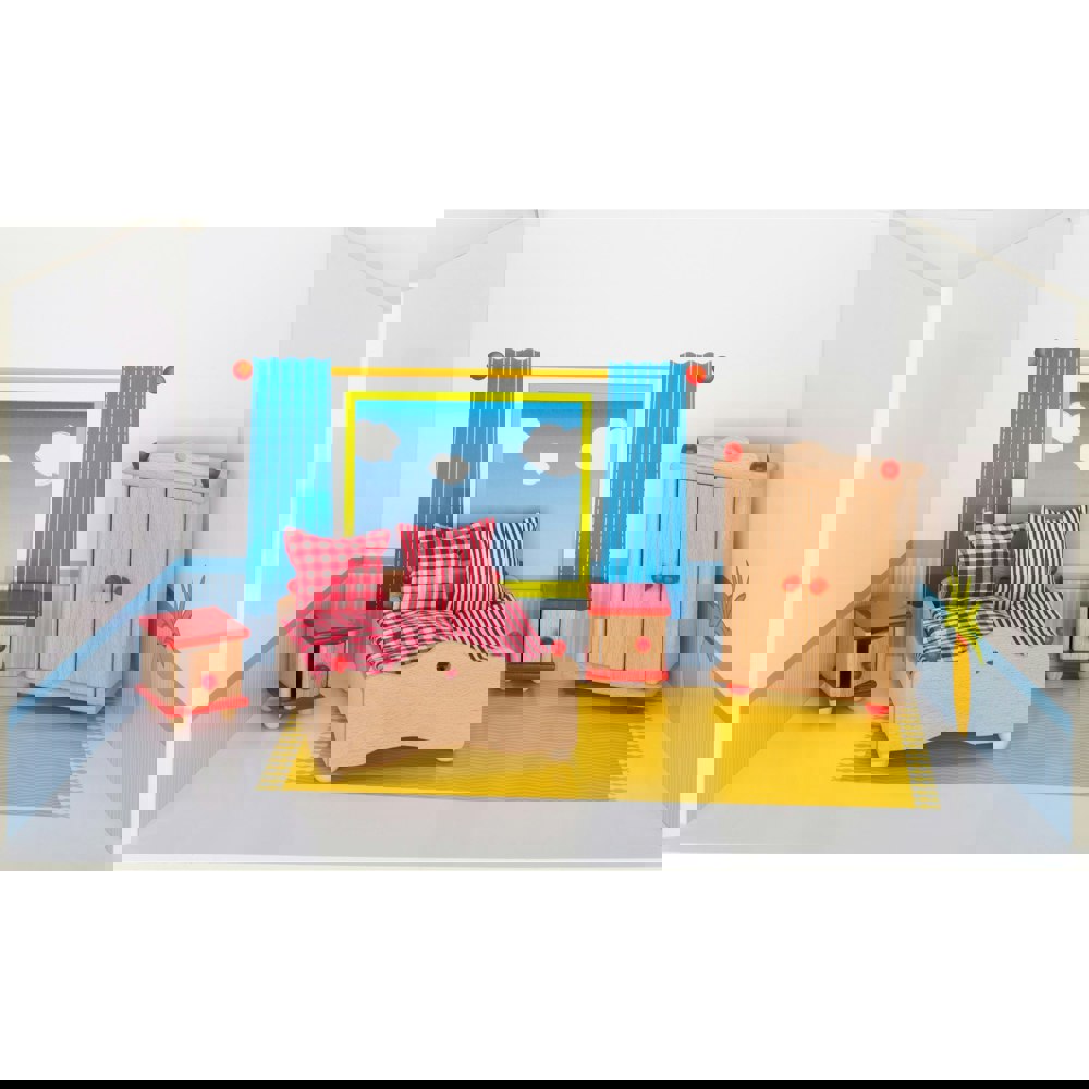 A realistically styled 9 piece wooden set of bedroom room furniture for your Goki doll's house, comprising a bed, a 13
