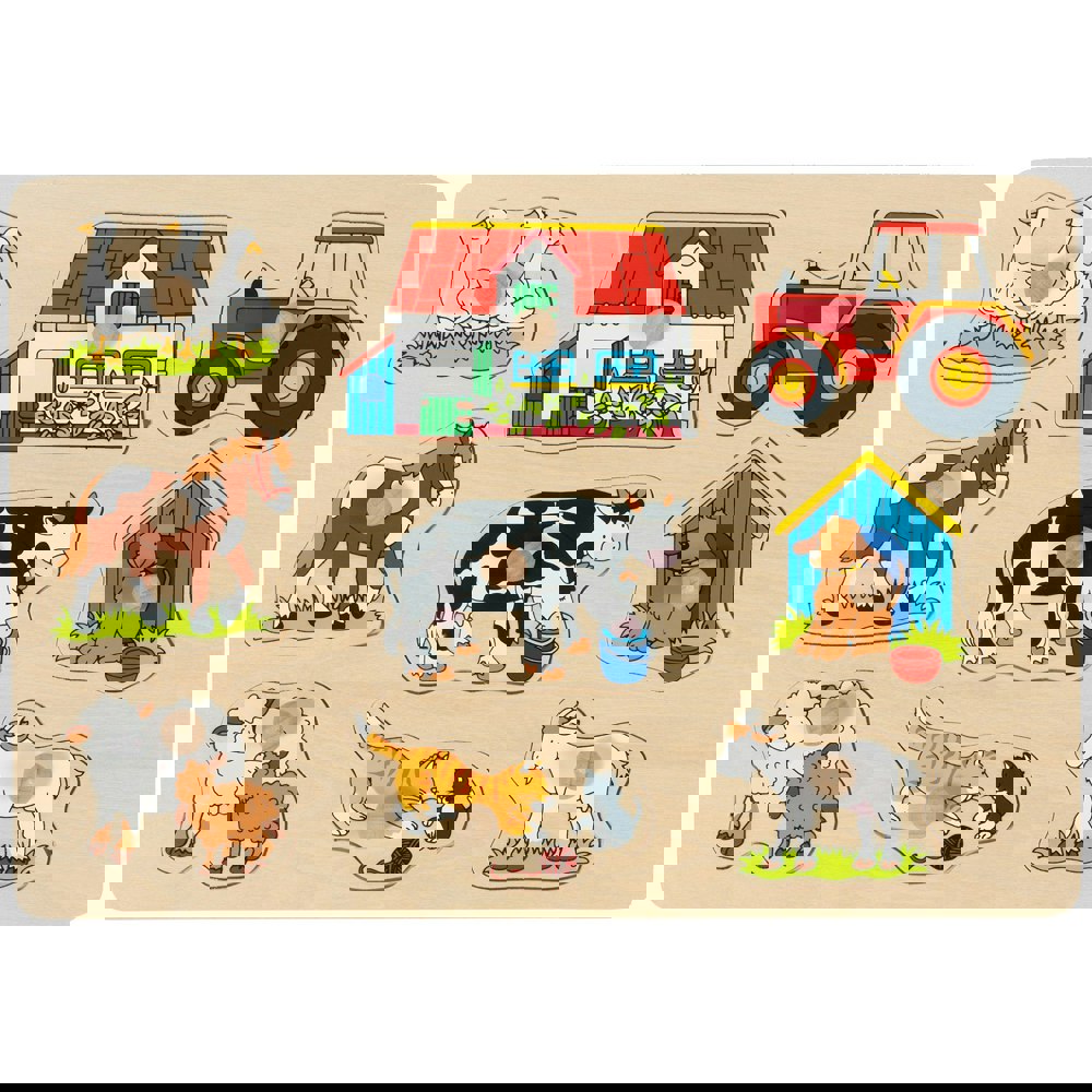 Made from wood, this extra large puzzle features farm animals, a farmhouse and farm equipment, fit the nine pieces the correct slots on the 30 x 21 x 2. 4 cm puzzle board to complete the farmyard scene. Suits ages 1 year plus.