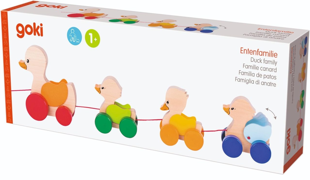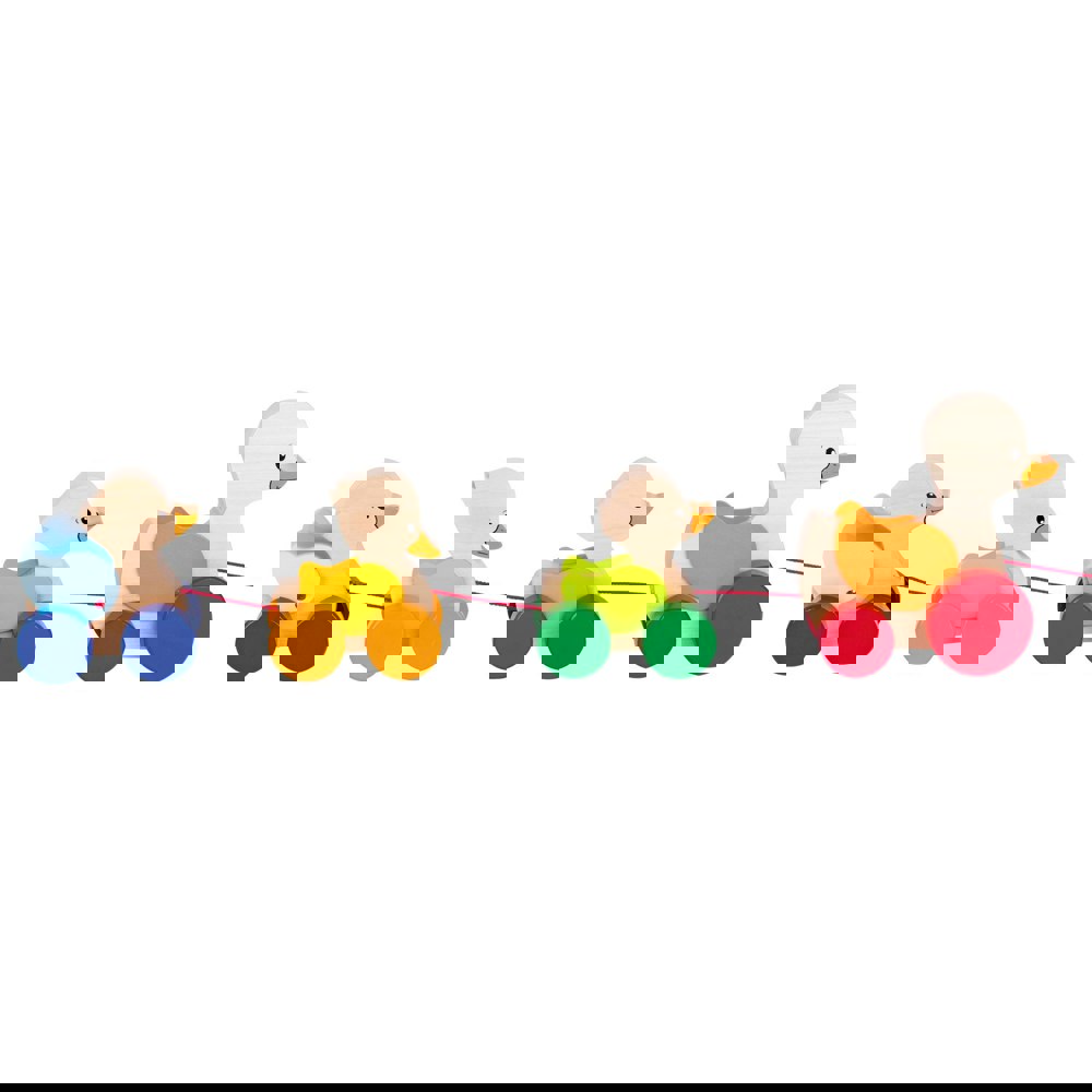 This cute, brightly coloured wooden pull along duck family is made from child friendly materials will keep your child company wherever they go, thanks to its pull cord. The rear blue ducking also has a flapping wing action.