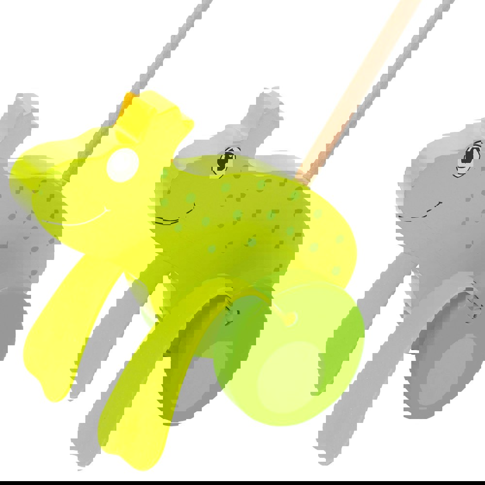 Made from wood, this cute push-along frog and a crown and when pushed mimics a jumping action and it also has flapping feet.