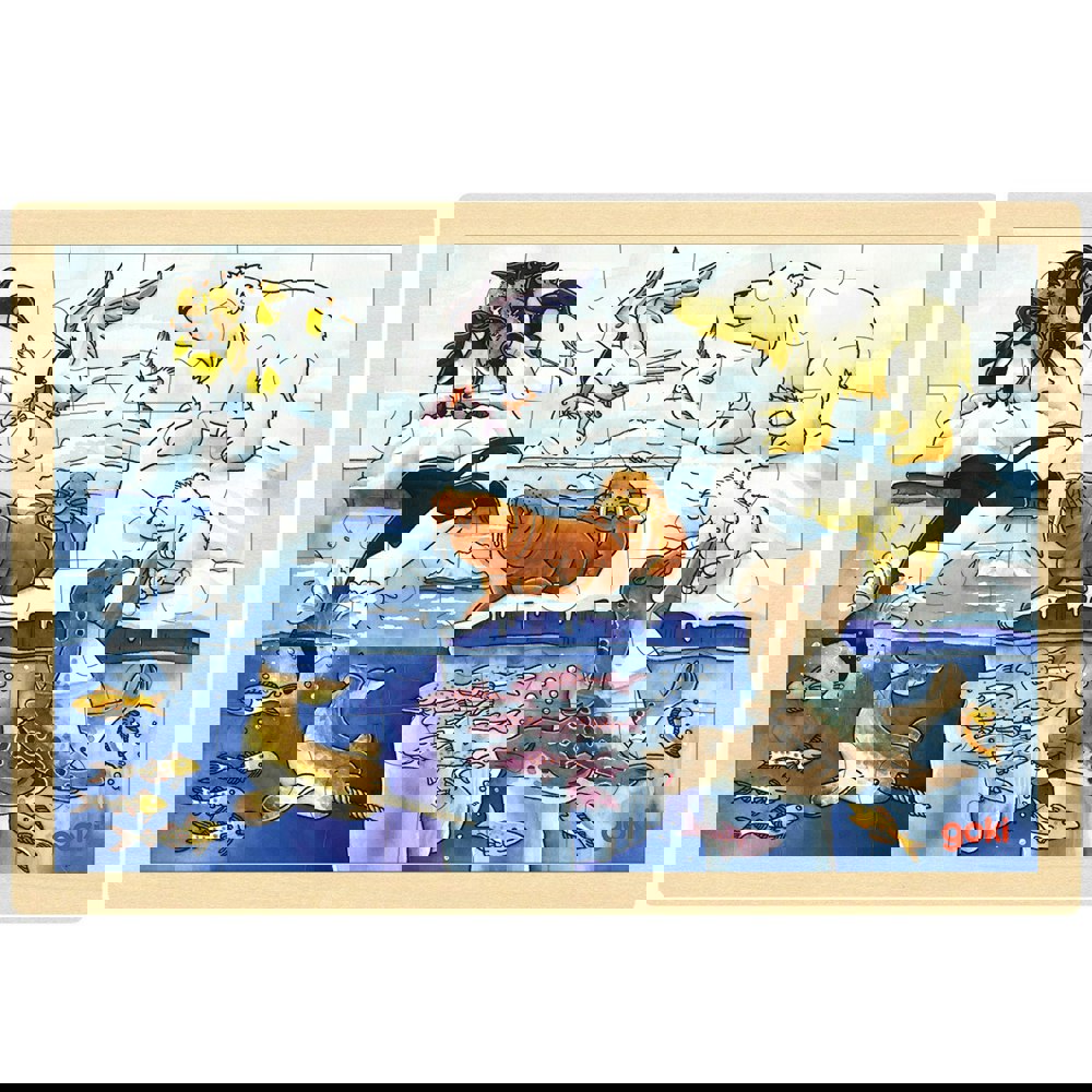 Discover the animals of the Artic ocean with this 24 piece wooden puzzle, once completed, it will show a beautiful Artic scene. Measures 30 x 20 x 0. 8 cm. Suits ages 3 years plus.