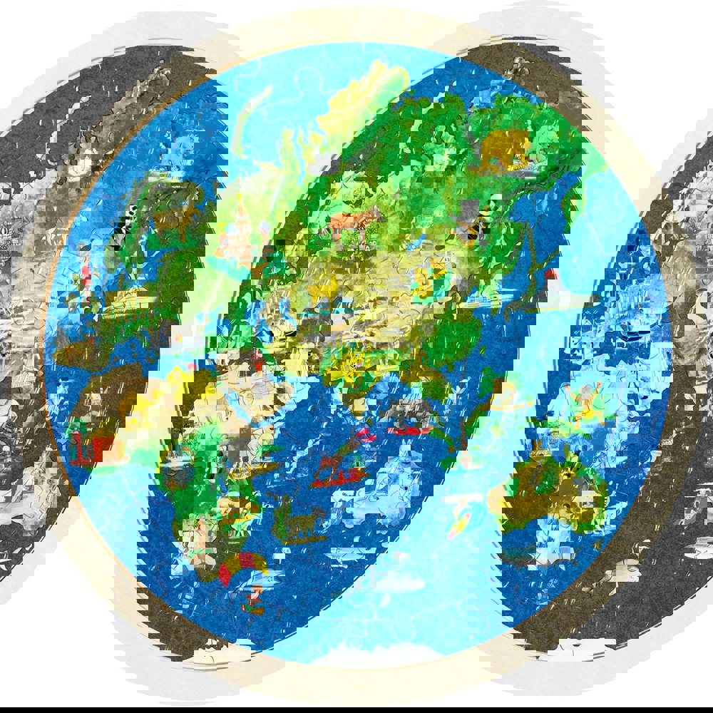 This double sided wooden puzzle has 57 pieces. On one size, there is Europe, Africa, Asia and Australasiais and on the other side, North and South America. Each continent piece has clues to where it belongs. Once completed, its diameter is 30 cm. Suits ages 6 years plus.