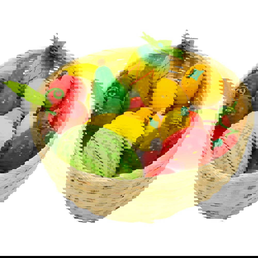 Perfect for your play kitchen or play market stand this large 21 cm wicker work bowl filled with 23 pieces of various fruit made of wood