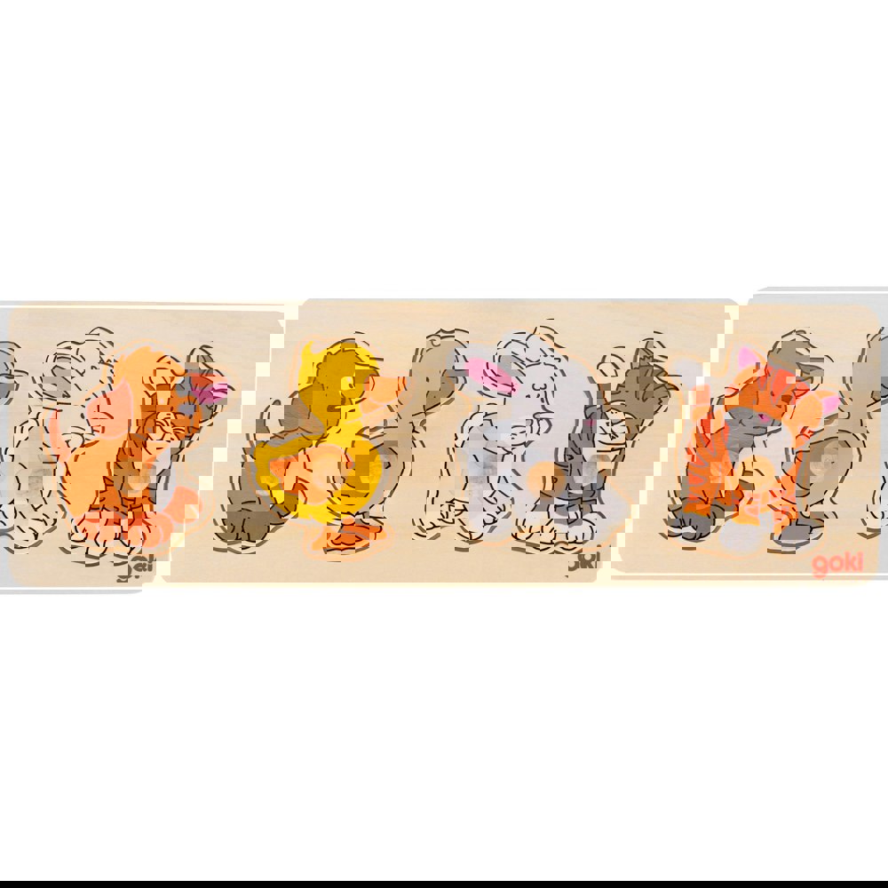 Made from wood, this extra large puzzle features cute baby animals, fit the four pieces depicting the baby animals into the correct slots on the 30 x 10 x 2