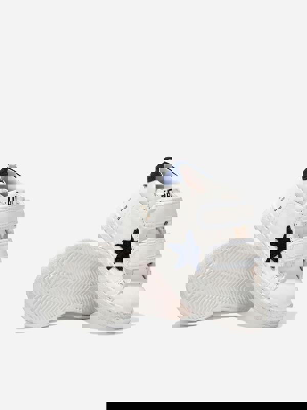Golden Goose Kids June Leather Star Trainers bring a distinctive look with a white nappa leather upper and a dark blue suede star. Made in Italy, this unisex pair combines archive-inspired styling with a vintage finish, finished with a dark blue suede heel tab. A velcro fastening completes the design for a clean, secure closure.