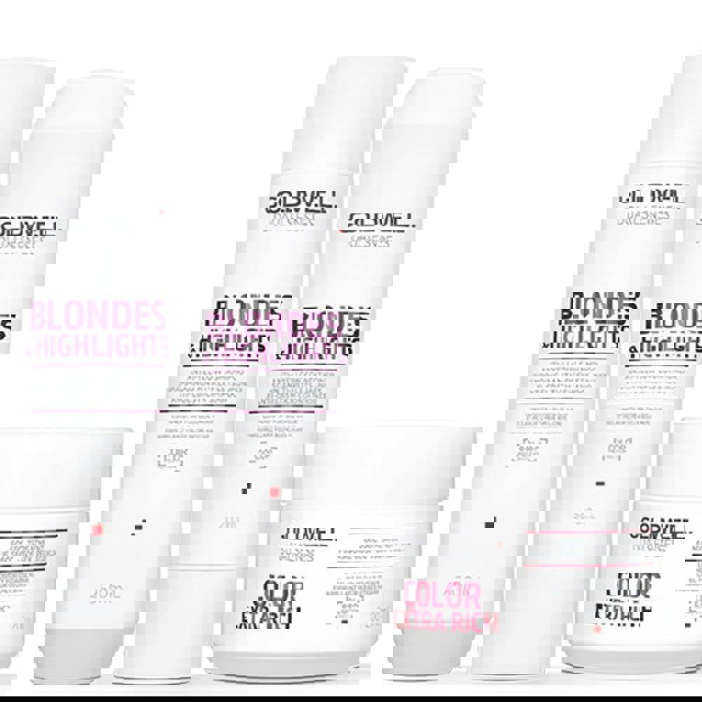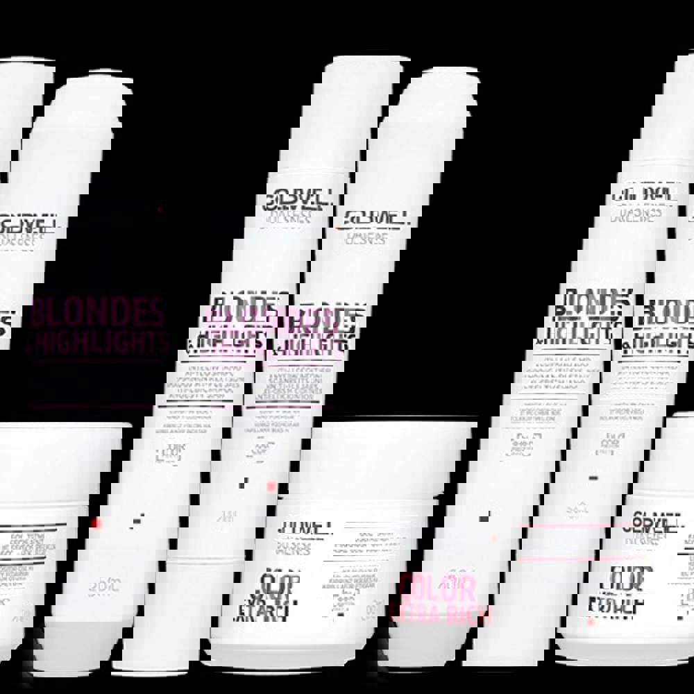 Goldwell Dual Senses Blonde & Highlights Anti-Yellow Shampoo 250ml, Conditioner 200ml and 60 Second Treatment 200ml Pack neutralizes unwanted yellow tones and brings out colour luminosity!
