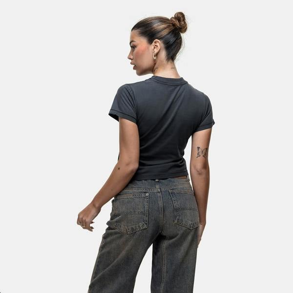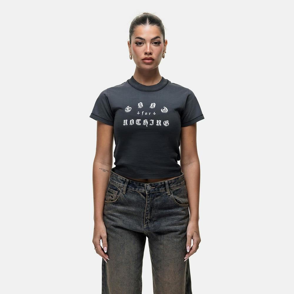 This baby tee is a bold addition to your casual wardrobe. Made from ultra-soft cotton for a comfortable feel, it features a striking front spray graphic and a cropped, fitted silhouette. Pair with joggers or cargo trousers for an effortlessly cool look. Model is 5'5" and wears a size S.