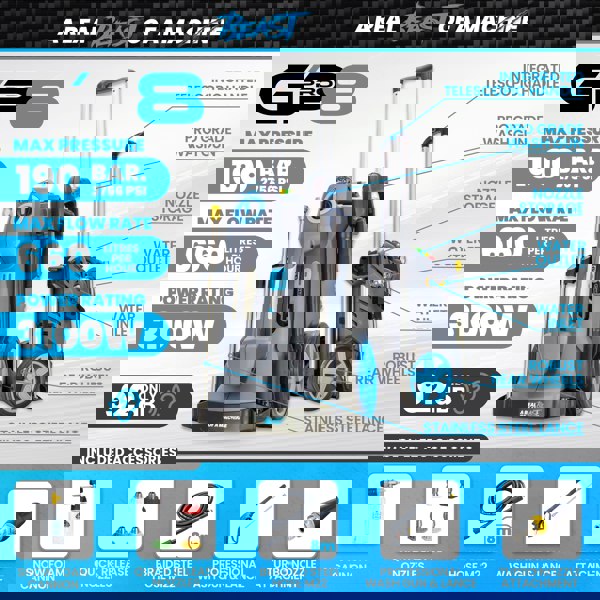 The GP8 delivers 190 bar max pressure and 11 L/min flow from a rugged 3100W induction motor — pro-level cleaning for patios, driveways, and vehicles.