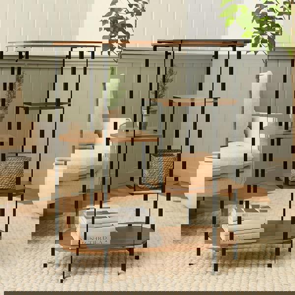 Four spacious wooden shelves provide plenty of room to display plants, books, ornaments or decorative accents. The curved edges soften the overall profile, making it an easy fit alongside sofas, under mirrors or against a wall where you want extra storage and a considered finishing touch.