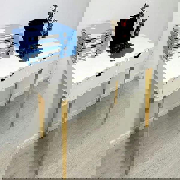 This Wooden Computer Desk and Dressing Table brings a clean, vintage-inspired look to your space, with an ivory white desktop paired with natural-coloured legs. Designed for everyday use, it offers a practical surface for working, studying or getting ready, making it a versatile choice for a study, bedroom, living room or office.