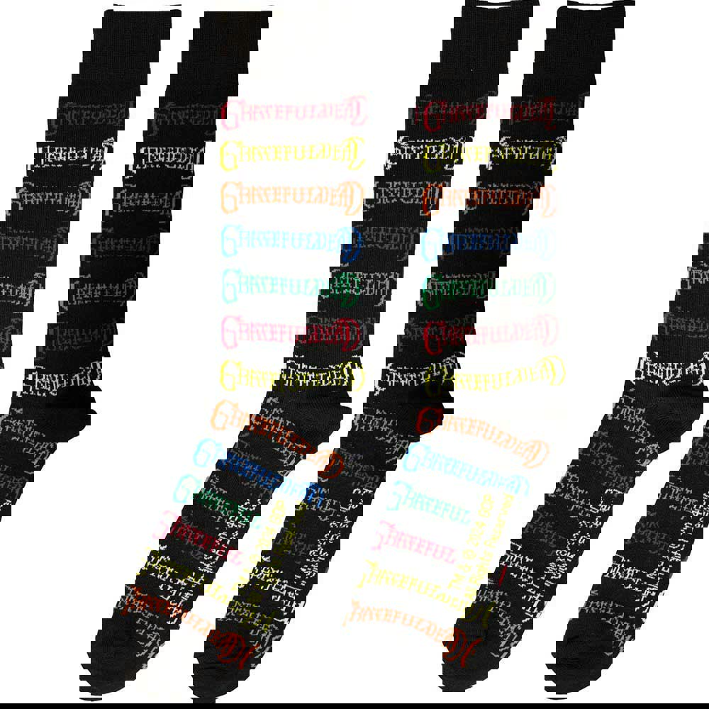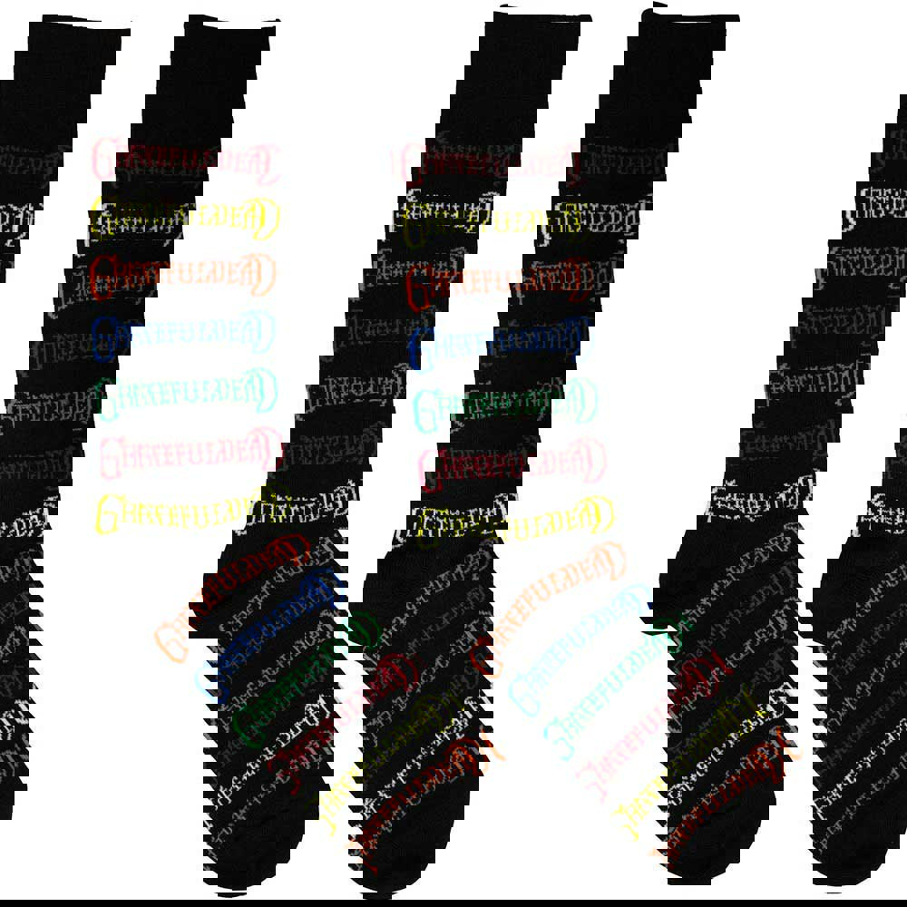 Official licensed Grateful Dead Unisex Ankle Socks featuring the 'Coloured Logos Pattern' design motif. High quality Ankle Socks available in a black colourway. These premium quality, colourful, all-over pattern cotton rich woven socks are guaranteed to stand out in the crowd.