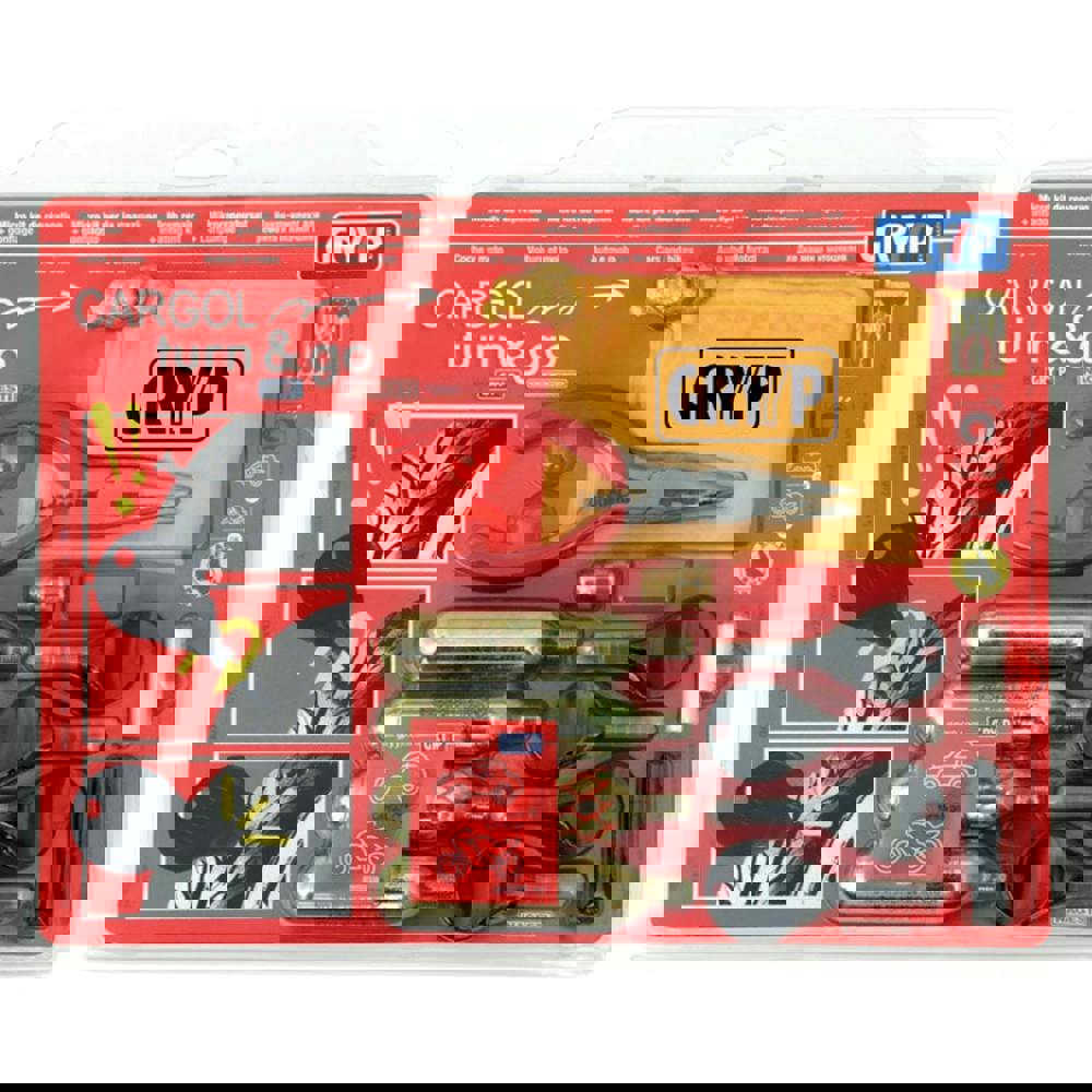 Comes with a marker, pliers, 4 Cargol puncture repair tools, a valve adaptor and a protective sleeve to use with the four 16g CO2 cylinders, 4 valve caps and a cloth carry bag.