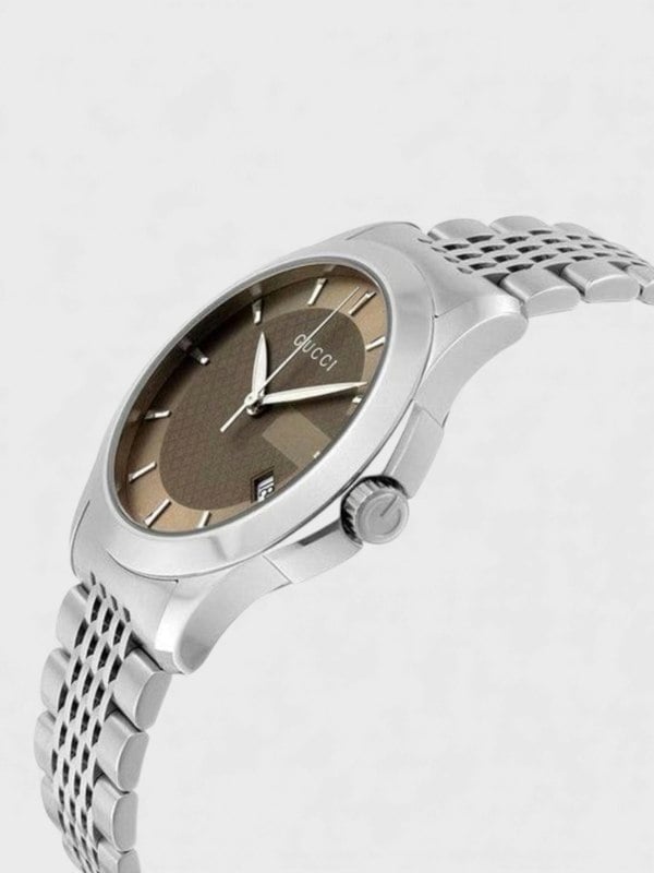 The Gucci G-Timeless Men's Watch YA126406 epitomises refined elegance with its harmonious blend of classic design and contemporary craftsmanship. The warm brown dial provides understated sophistication, whilst the polished silver bracelet delivers a timeless aesthetic that transitions seamlessly from boardroom to evening occasions. This iconic timepiece showcases Gucci's heritage of luxury watchmaking, featuring precise movement and meticulous attention to detail. A distinguished accessory for the discerning gentleman seeking enduring style and reliability.