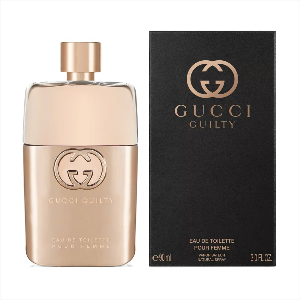 Gucci Guilty Pour Femme Eau de Toilette 90ml is an ambery floral scent designed for the modern, liberated woman. It features a vibrant top of mandarin and pink pepper, a heart of lilac, peach, raspberry, and geranium, and a sensual base of patchouli and amber. The bottle, a metallic rose gold flacon, echoes the shape of the men's fragrance and reflects the brand's theme of equality and self-expression