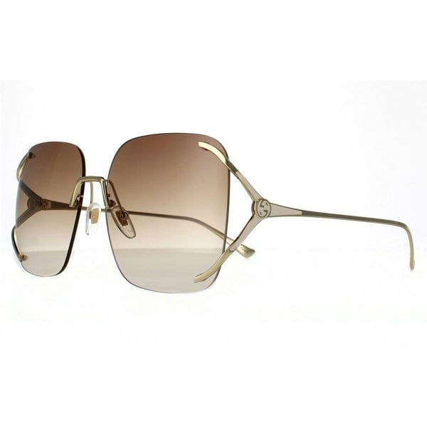 Gucci brings a refined, rimless silhouette to the fore with the GG0646S 002 sunglasses. Shaped with a square profile, the gold-tone metal frame keeps the look clean and lightweight, while the brown gradient lenses add depth of colour across the front.