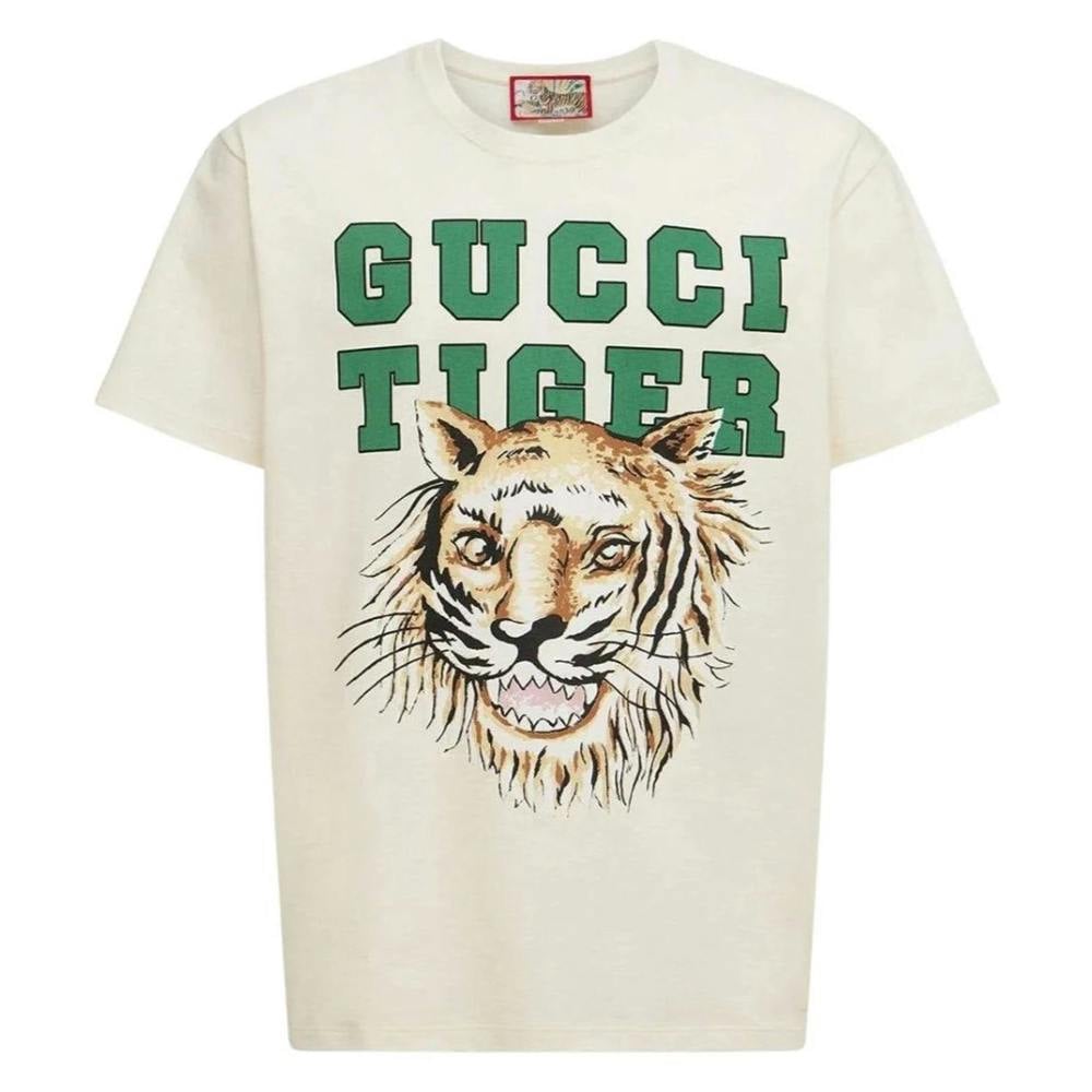 This white cotton jersey T-shirt is defined by a tiger face over the motto 'Gucci Tiger. ' References to the feline are often seen throughout the Creative Director's collections as an expression of the House's fascination with the wild beauty of the natural world