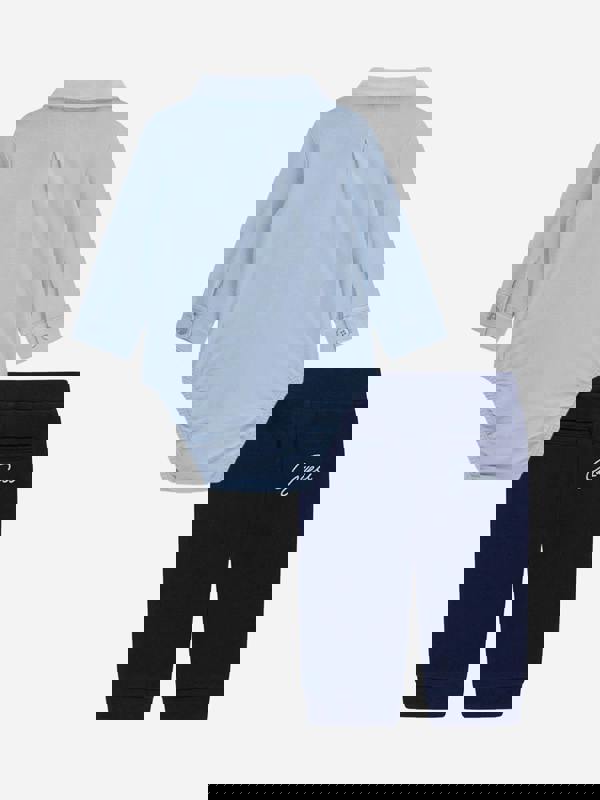 This baby boys bodysuit and trousers set comes in an arctic sky blue colourway. The two-piece outfit reflects Guess’s Californian aesthetic and dynamic personality, with embroidered branding on both pieces. The top has long sleeves and a bow detail, finished with elasticated bottoms for a secure shape. Coordinating trousers complete the set with an elasticated waistband and elasticated ankles.