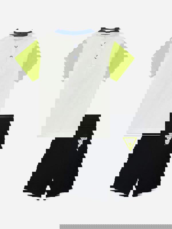 This baby boys set from Guess includes a T-shirt and matching shorts. The T-shirt comes in pure white with a racing track fast car design, finished with a round neck, short sleeves and a straight hem. Press-studs complete the T-shirt for easy fastening.