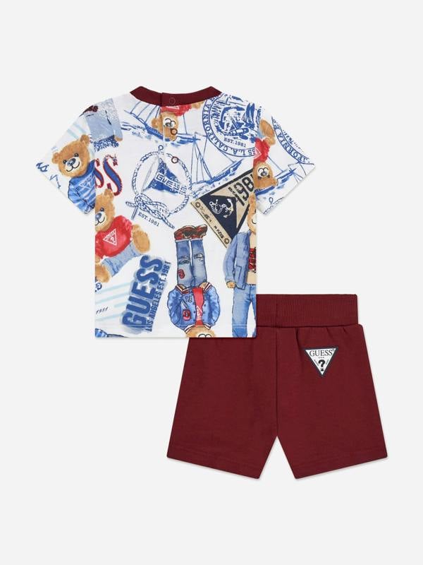 The burgundy T-shirt has a ribbed round neck, short sleeves and press-stud fastenings, finished with a Guess triangle and teddy bear print. Matching shorts complete the look with an elasticated drawstring waist and a Guess triangle logo on the back.