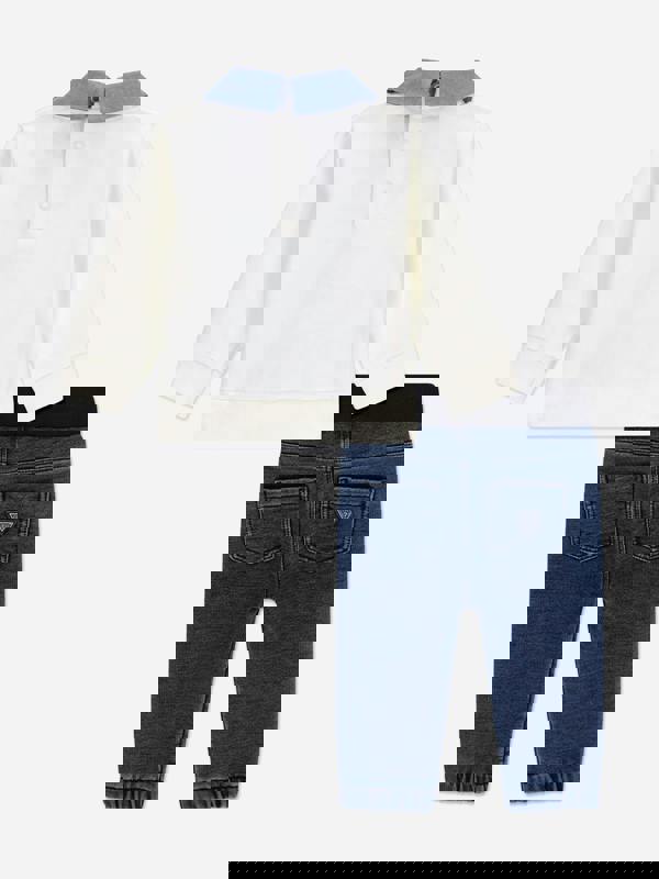 This two-piece set from Guess pairs a sweatshirt with matching trousers. The sweatshirt has a collar, long sleeves and ribbed detailing, finished with press-stud fastenings and a teddy bear print. The trousers have a wide elasticated waist and elasticated ankles, with pockets at the back.