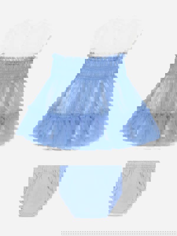 This baby girls dress from Guess pairs a skater silhouette with a tiered tulle hem skirt. The mixed material construction is finished in blue, with a silver sequin embellished Guess print for a distinctive branded look.