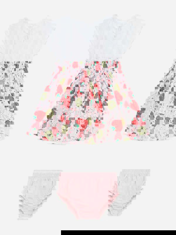 This baby girls’ set from Guess includes a pink dress and matching knickers. The dress has a strawberry motif, adding a playful printed finish to the look. A coordinating pair of knickers completes the outfit as a two-piece ensemble.