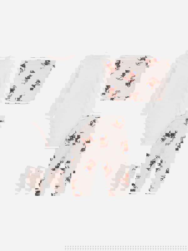 This baby girls bodysuit set by Guess comes in pink with a teddy bear motif. The set includes a bodysuit with snap fastenings for dressing.