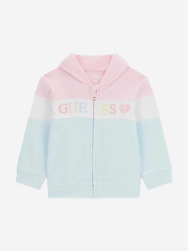 This baby girls tracksuit set brings together a zip-up hoodie, joggers and a coordinating white body vest. The hoodie and joggers come in soft jersey cotton and are embroidered with a colourful logo. The body vest is finished with a pink triangle logo and uses a soft, stretchy jersey blend for comfortable wear.
