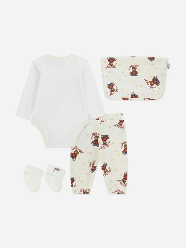 This Guess baby bodysuit set comes in ivory with a teddy bear design. The set suits baby boy and baby girl.
