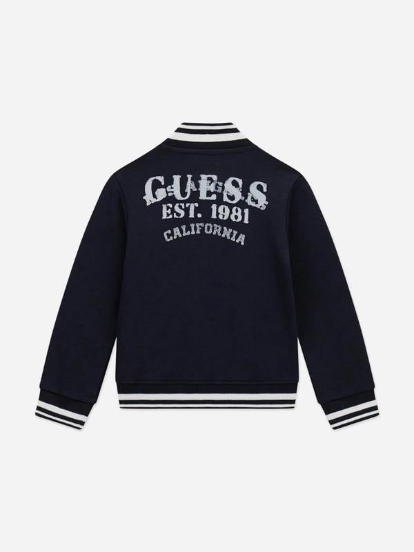 This boys bomber jacket by Guess comes in navy fleece. The fleece material gives a soft finish, while the bomber silhouette keeps the look classic and clean for everyday wear.