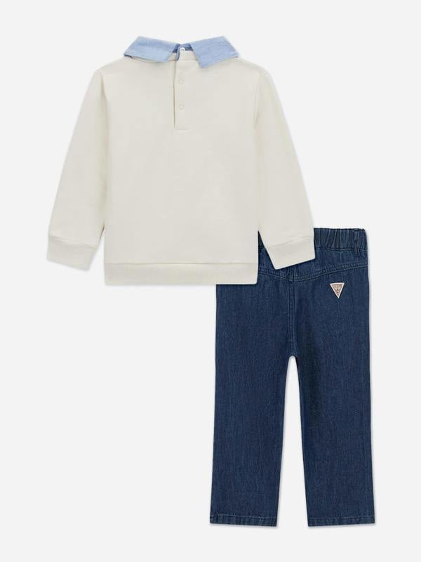 This boys set pairs a sweater with denim trousers in a muted stone tone. It comes as a two piece outfit and reflects Guess’s Californian aesthetic with an uncomplicated, clean look.