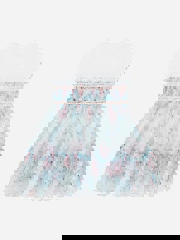 This girls butterfly collage t-shirt dress from Guess comes in blue with an abstract collage print. Made from cotton jersey, it has a round neck and short sleeves for a simple, easy-to-wear shape. The coupe fit and flare silhouette adds movement, while tulle detailing completes the look.