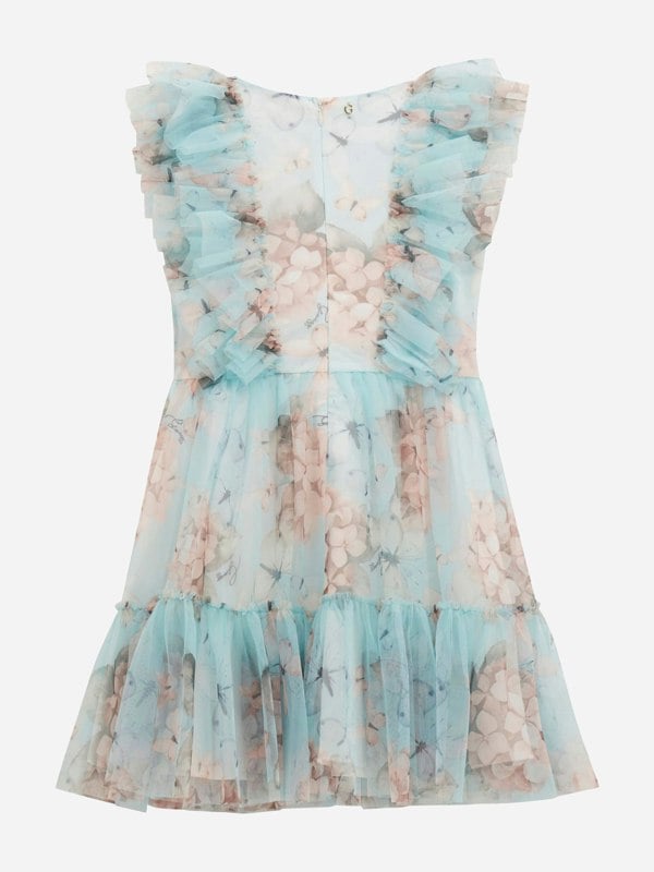 This girls tulle dress by Guess comes in a vibrant blue colourway with a butterfly collage print. A lightweight tulle construction creates a floaty silhouette, making it a standout option for spring and summer occasions.