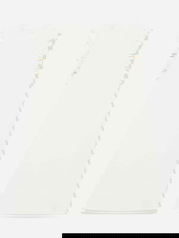 This girls dress from Guess comes in an ivory tone with a clean, sleeveless shape. A round neck keeps the look simple, while ruffle detailing adds texture through the design. The front is finished with a glittery bow and heart motif alongside a Guess print.