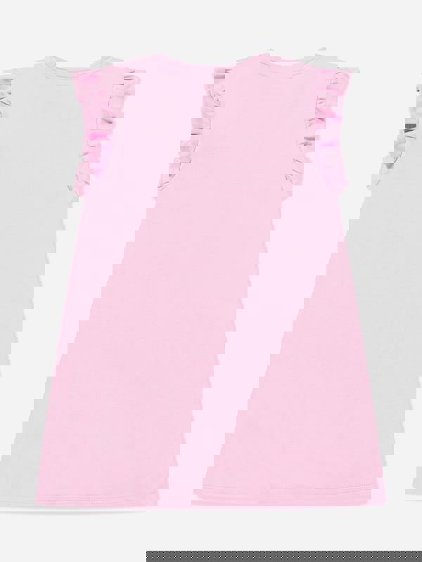 This girls dress from Guess comes in blooming azalea pink with a sleeveless cut and round neckline. Ruffle detailing adds texture, while a glittery bow and heart motif sits alongside a Guess print for a bold branded finish.