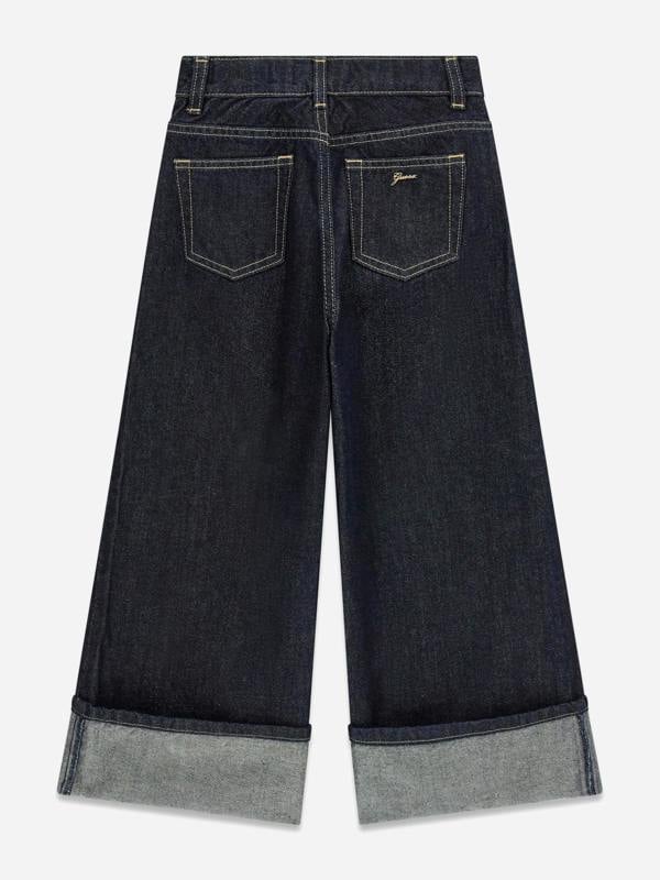 These girls palazzo jeans from Guess come in blue with a wide leg silhouette and a high waist. A five-pocket construction and button closure keep the look classic, while the palazzo fit adds a more relaxed shape through the leg. Made as stretch jeans, they include lurex for added detail.