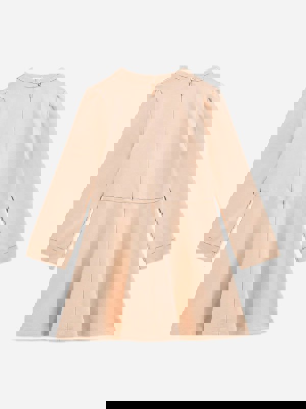 This girls’ Punto Milano dress from Guess comes in pink with a skater silhouette and flared skirt. A round neck and long puffy sleeves create a structured look, finished with ribbed cuffs for a neat outline. Sequin detailing adds a distinctive branded touch.