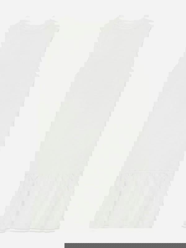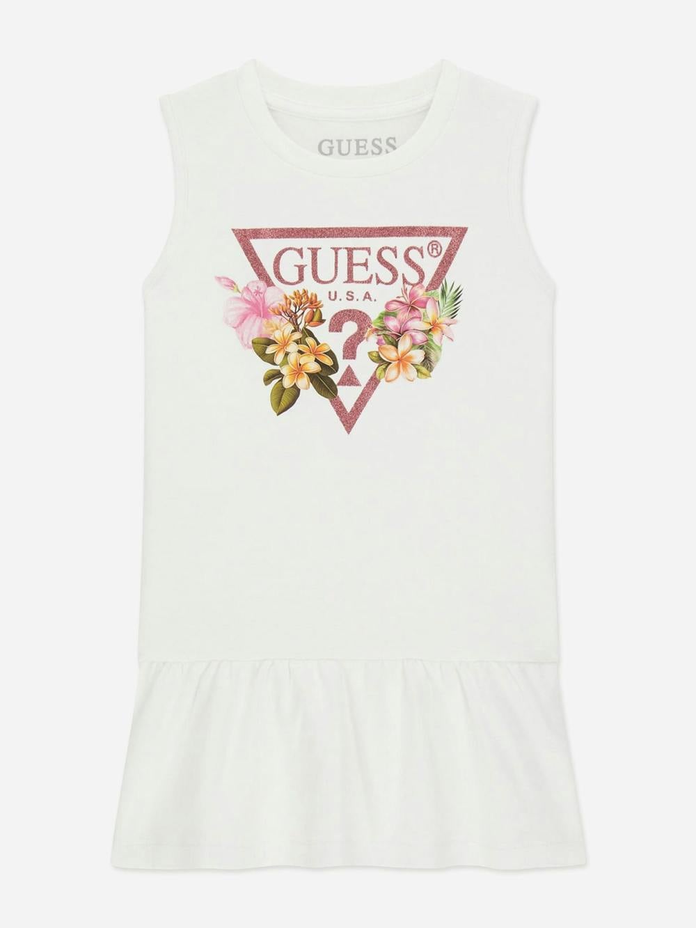 This girls off white multi dress forms part of the Guess SS26 collection, drawing on vintage archive aesthetics. It has a round neck and an interlock sleeveless design, finished with a flared hem for a defined shape. A Guess USA triangle print adds a clear branded detail to the front.