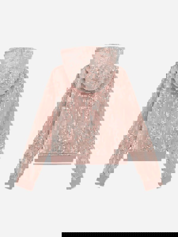 This girls zip-up top by Guess comes in pink with an all-over sequin finish for a high-shine look. A hood and front zip fastening keep the design practical, while ribbed trim adds a neat, structured edge. Gold-tone details and embellishments complete the look with signature Guess styling.