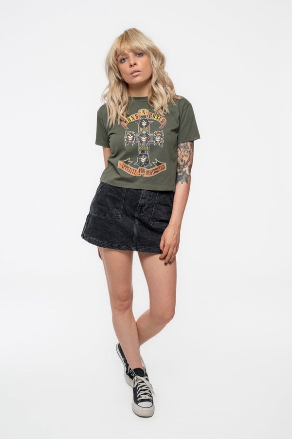 An official licensed Guns N Roses Ladies Crop Top featuring the 'Appetite For Destruction' design motif. This high quality Crop Top is available in a green colourway. We offer a range of sizes from Small through XX-Large, subject to stock availability.