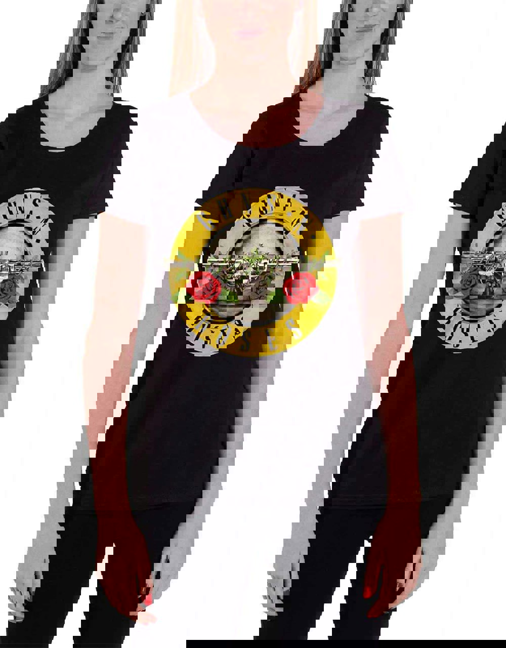 An official licensed Guns N' Roses Ladies Tee featuring the 'Classic Bullet Logo ' design motif. This high quality t-shirt design is available in the black colourway. We offer a range of sizes from Small through XX-Large, subject to stock availability.