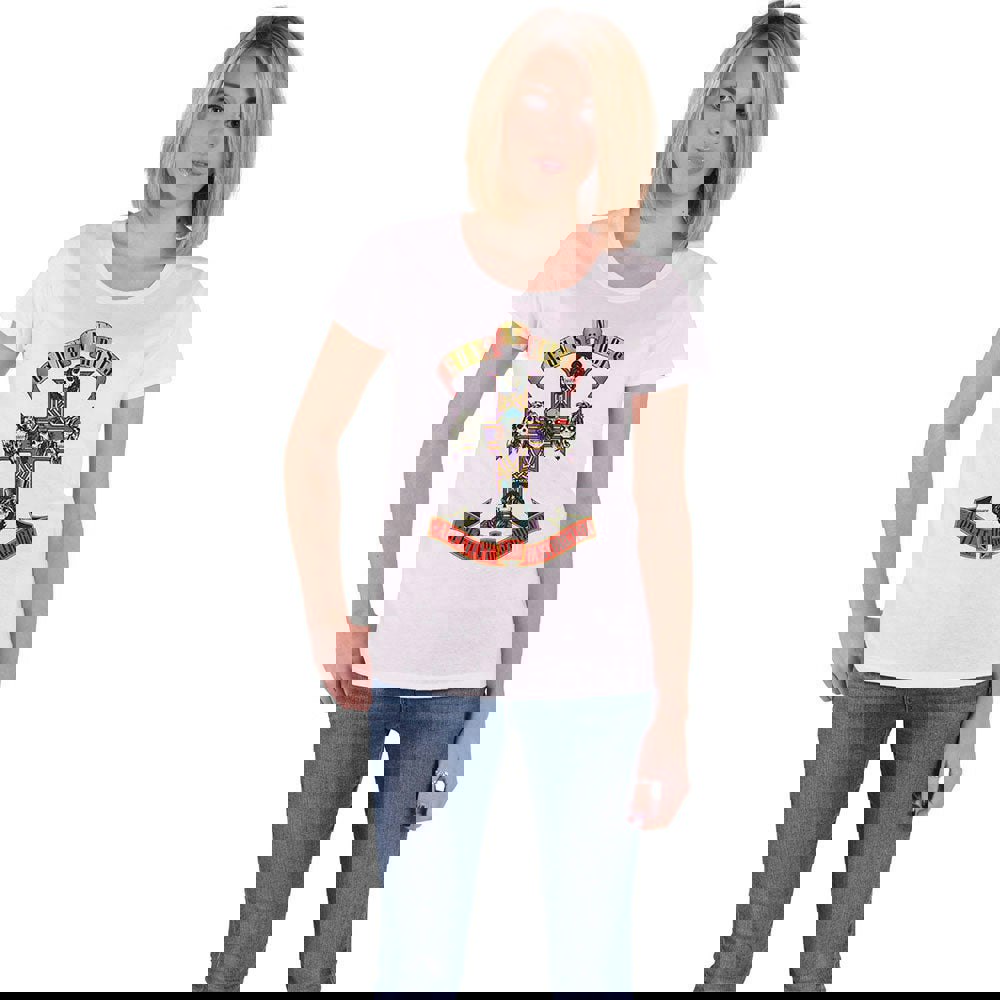 An official licensed Guns N' Roses Ladies Tee featuring the 'Appetite for Destruction' design motif. This high quality t-shirt design is available in the white colourway. Soft-style cotton Ladies fit t-shirt with short sleeves and crew neck. Comes in a wide range of sizes from Small through XX-Large, subject to availability.