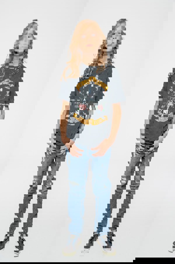 An official licensed Guns N' Roses Kids T-Shirt featuring the 'Appetite' design motif. This high quality T-Shirt is available in a black colourway. High quality retro style tee with short sleeves & crew neck. Features front printing and dye wash finish. The eco friendly t-shirt blank is manufactured using recycled materials comprising 60% recycled Cotton and 40% recycled Polyester. Comes in a wide range of sizes from 1 years through 12 years.