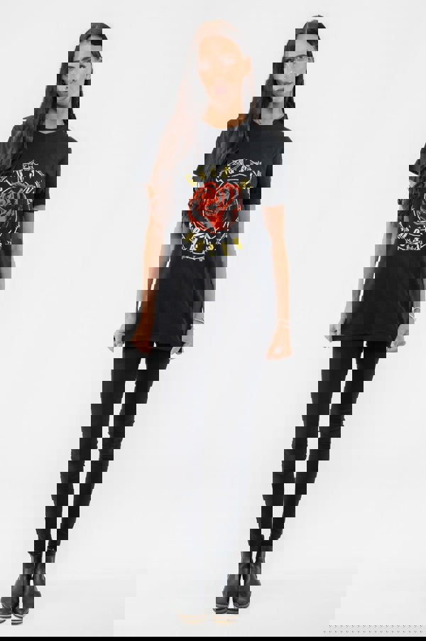 An official licensed Guns N' Roses T-Shirt featuring the 'Rose Circle Paradise City' design motif. This high quality T-Shirt is available in a black colourway. Classic soft-style cotton tee with crew neck and short sleeves. Features front and back printing. Comes in a wide range of sizes from Small through XX-Large, subject to availability.