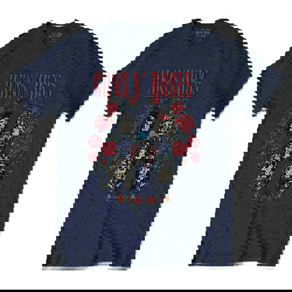 An official licensed Guns N' Roses T-Shirt featuring the 'Skulls Wreath' design motif. This high quality T-Shirt is available in a navy blue colourway. Classic soft-style cotton tee with front printing, crew neck and short sleeves. Comes in a wide range of sizes from Small through XX-Large, subject to availability.