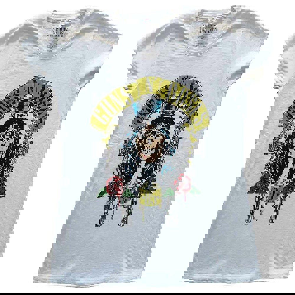 An official licensed Guns N' Roses ladies tshirt featuring the 'Slash '85' design motif. This high quality tshirt is available in a white colourway. Classic ladies fit tshirt featuring crew neck, short sleeves and front printing. Comes in a wide range of sizes from X-Small through XX-Large, subject to availability.