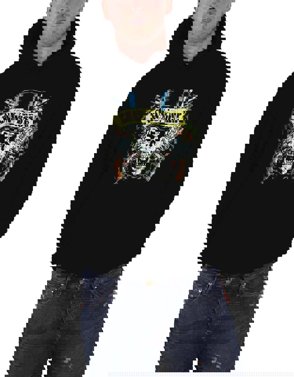 An official licensed men's Pullover Hoodie featuring the Guns N' Roses 'Top Hat' Band Logo graphic design on a 100% cotton. Classic men's fit pullover style hoodie with pouch pockets. This high-quality hooded top is available in a black colourway. Size options include Small through XX-Large.